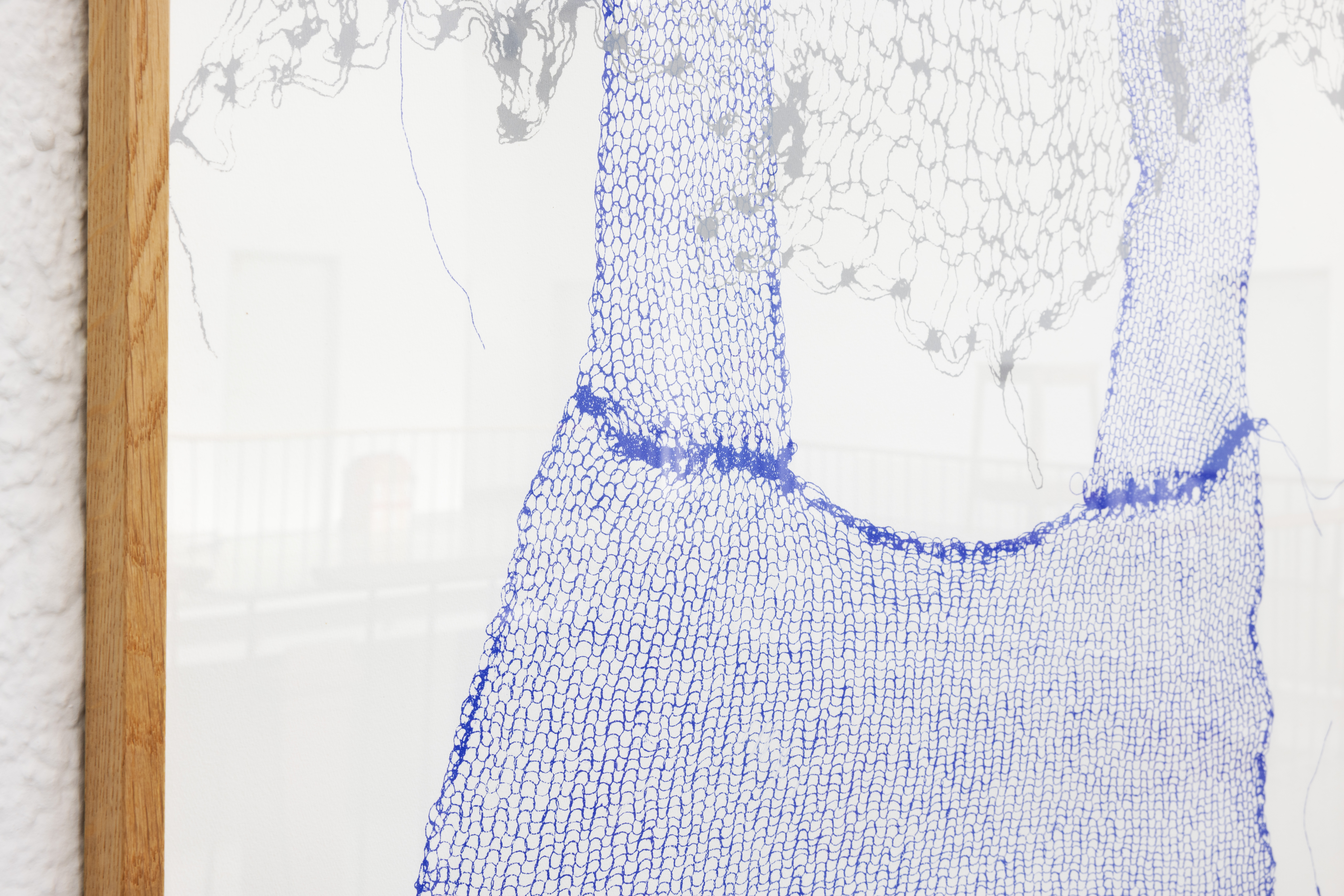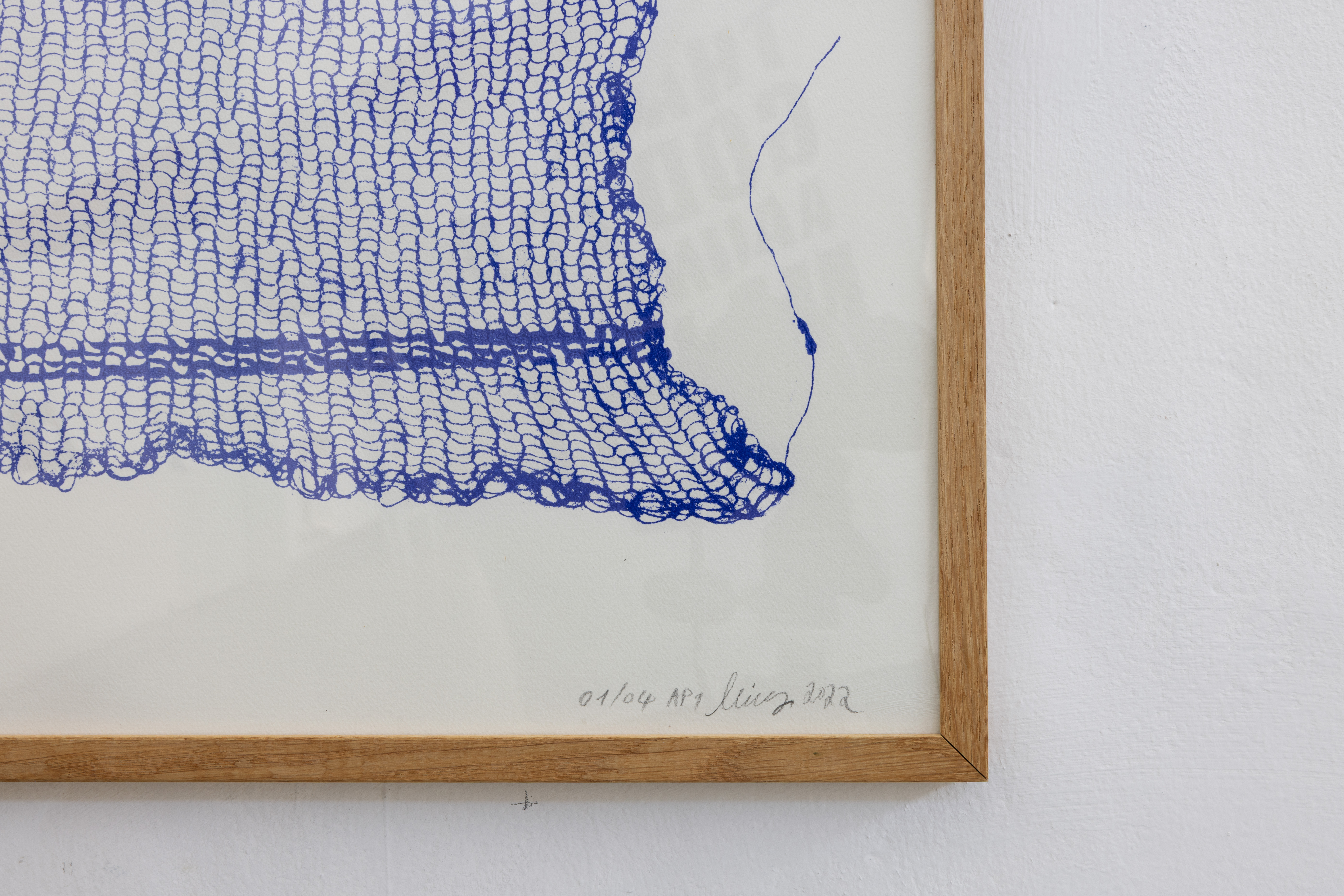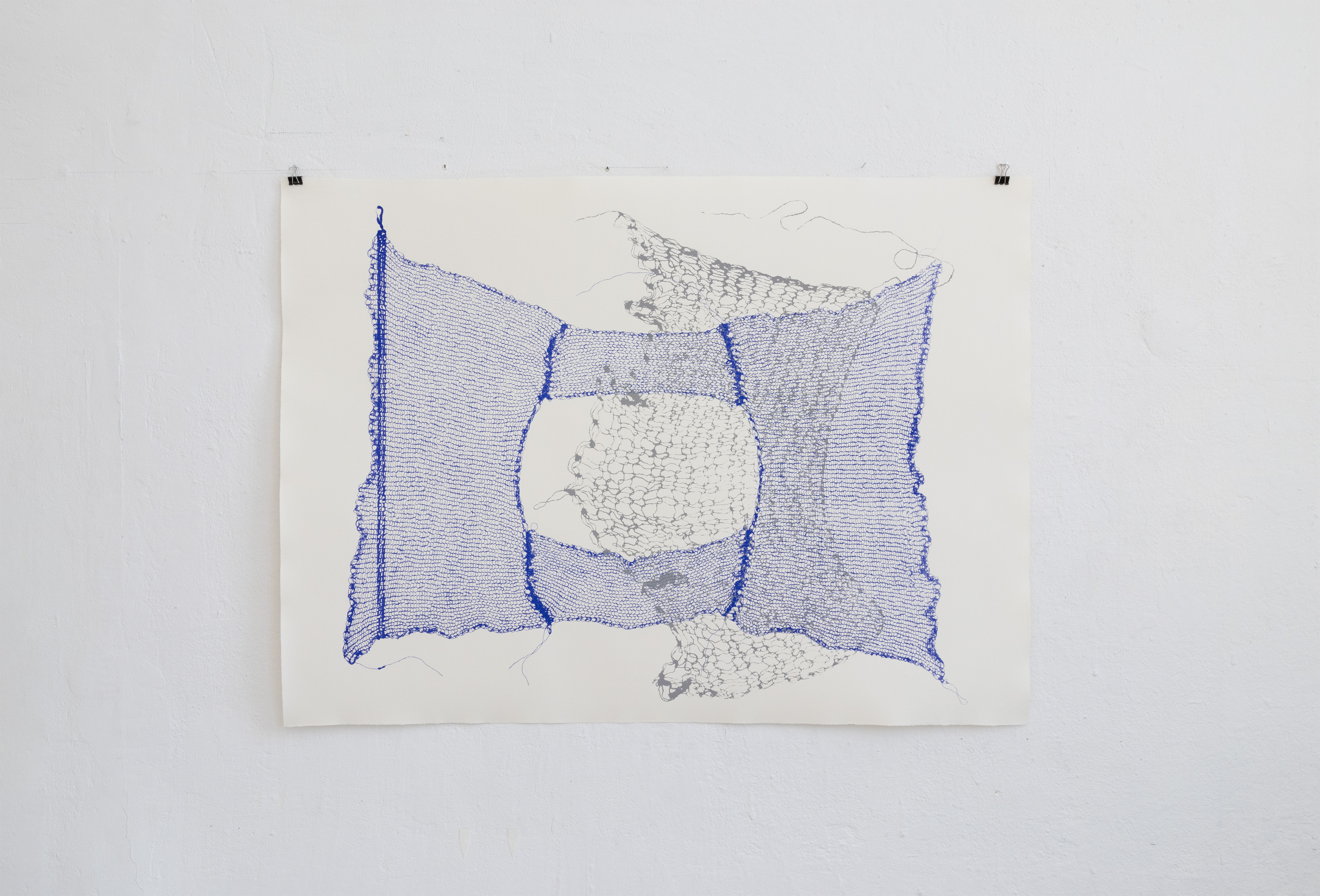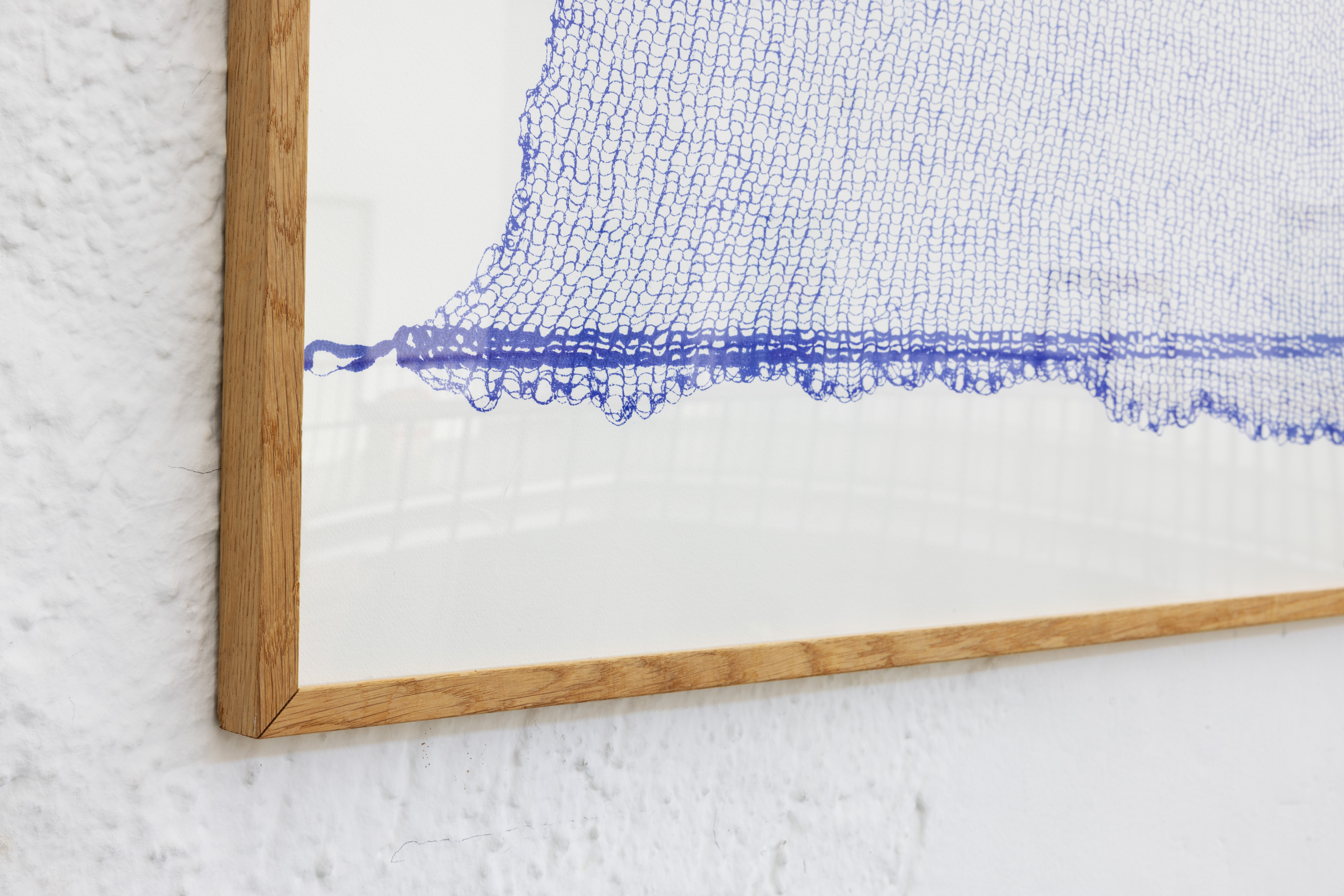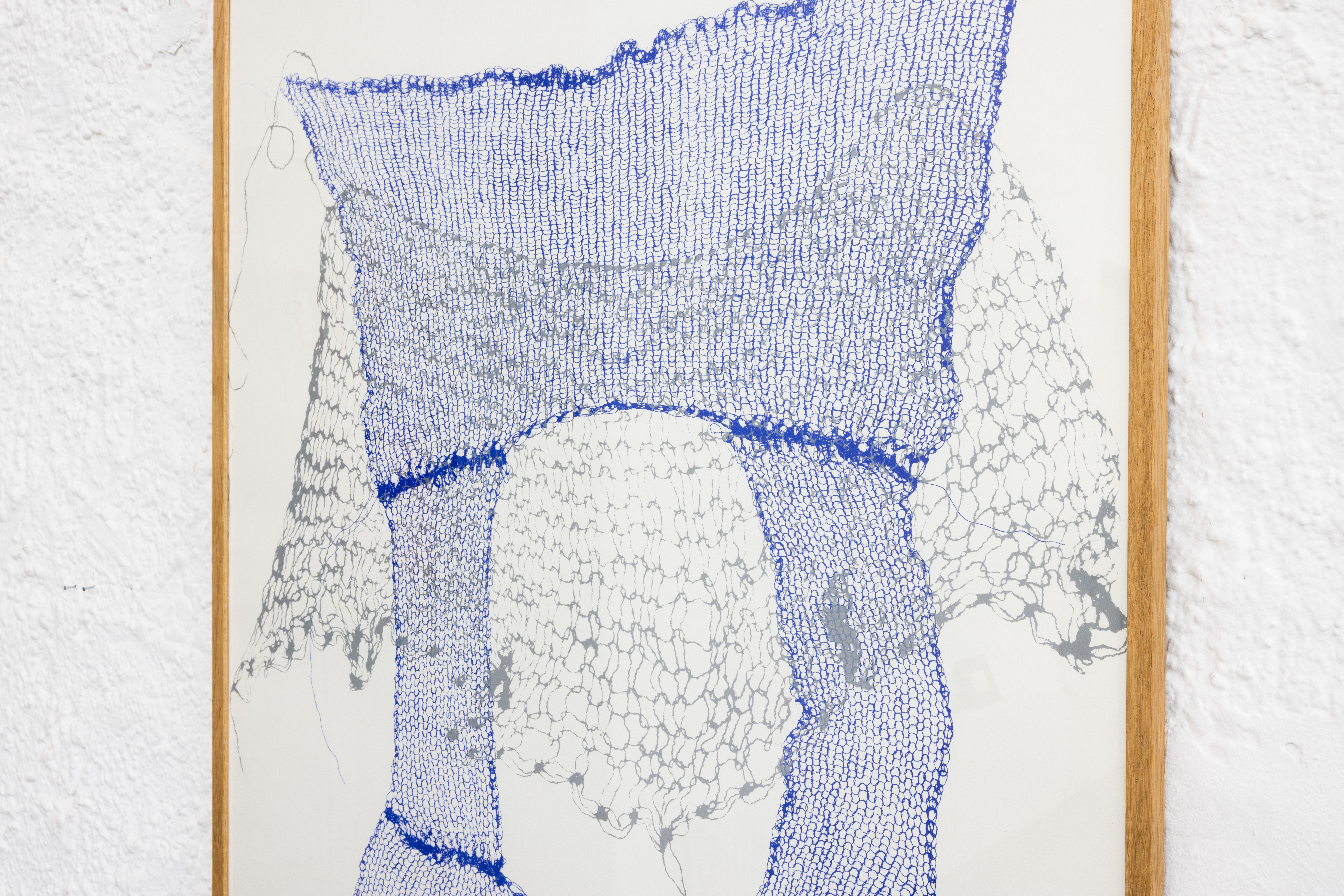 The knitted panel is then placed between a sheet of glass and the silkscreen plate for exposure in UV light. The photosensitive layer painted on the silkscreen allows the lights to precisely picture every detail from the knitted garment, transferring the original shape and haptics of the fabric into a two-dimensional image. The process of exact image transfer from an object into an image not only creates a portrait of the muted panel, which is considered by the artist a graphic score for the sound piece, but also it is an experimentation to transform something ephemeral and fragile into something more robust and rather eternal. The artist has always worked with yarn as a sculptural material, and despite its beautiful and complex visual impression, the material is very fragile and might collect clusters of dust and deteriorate over time. In order to preserve the beautiful characteristics of the material and at the same time combat the fragility of it, the artist came up with silk screen as a technique to make some yarn evolve into a durable material. With the vibrant blue color printed on handmade paper, a feeling of delicacy and detail is immediately conveyed, similar to watching a piece of real knitted mohair garment.