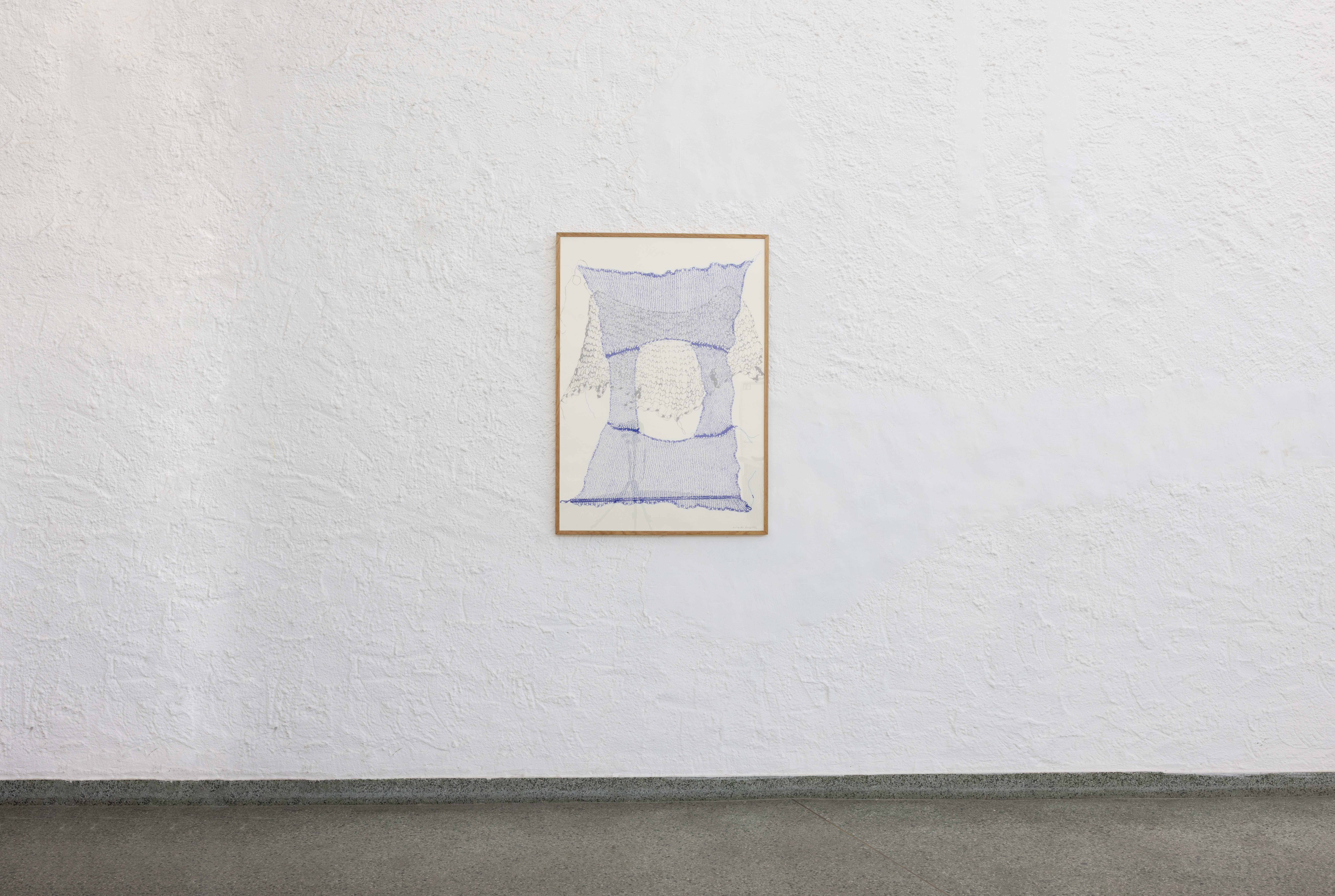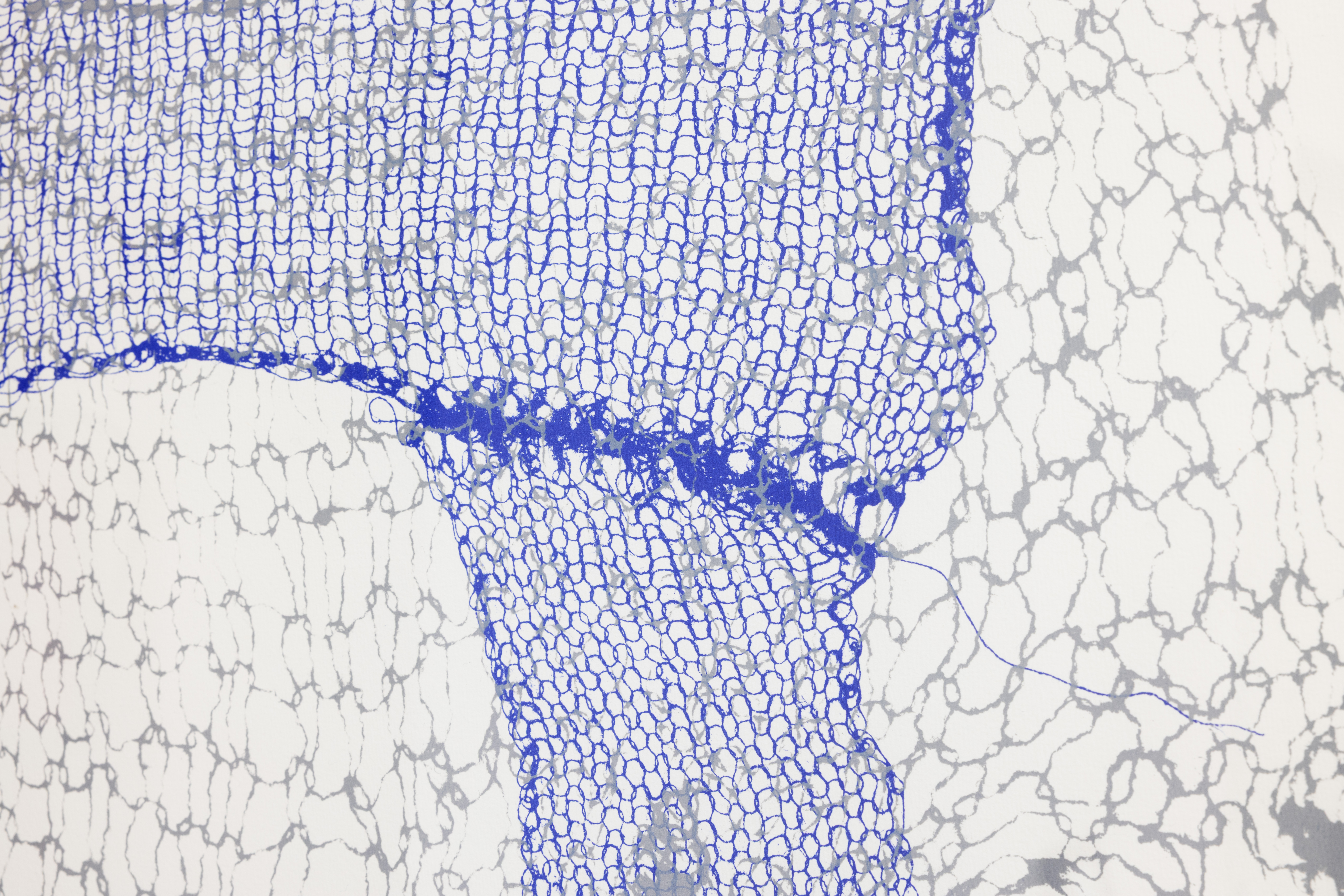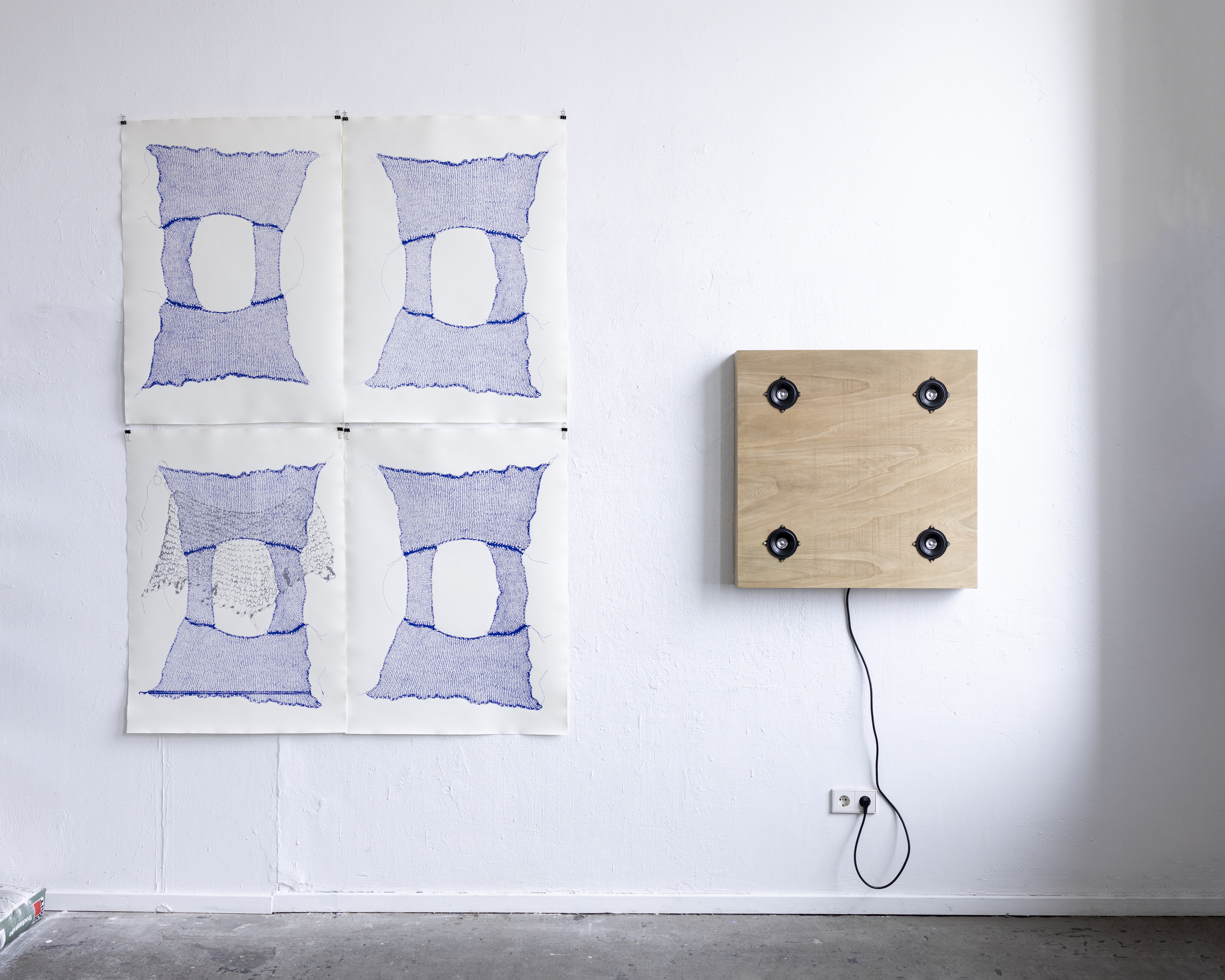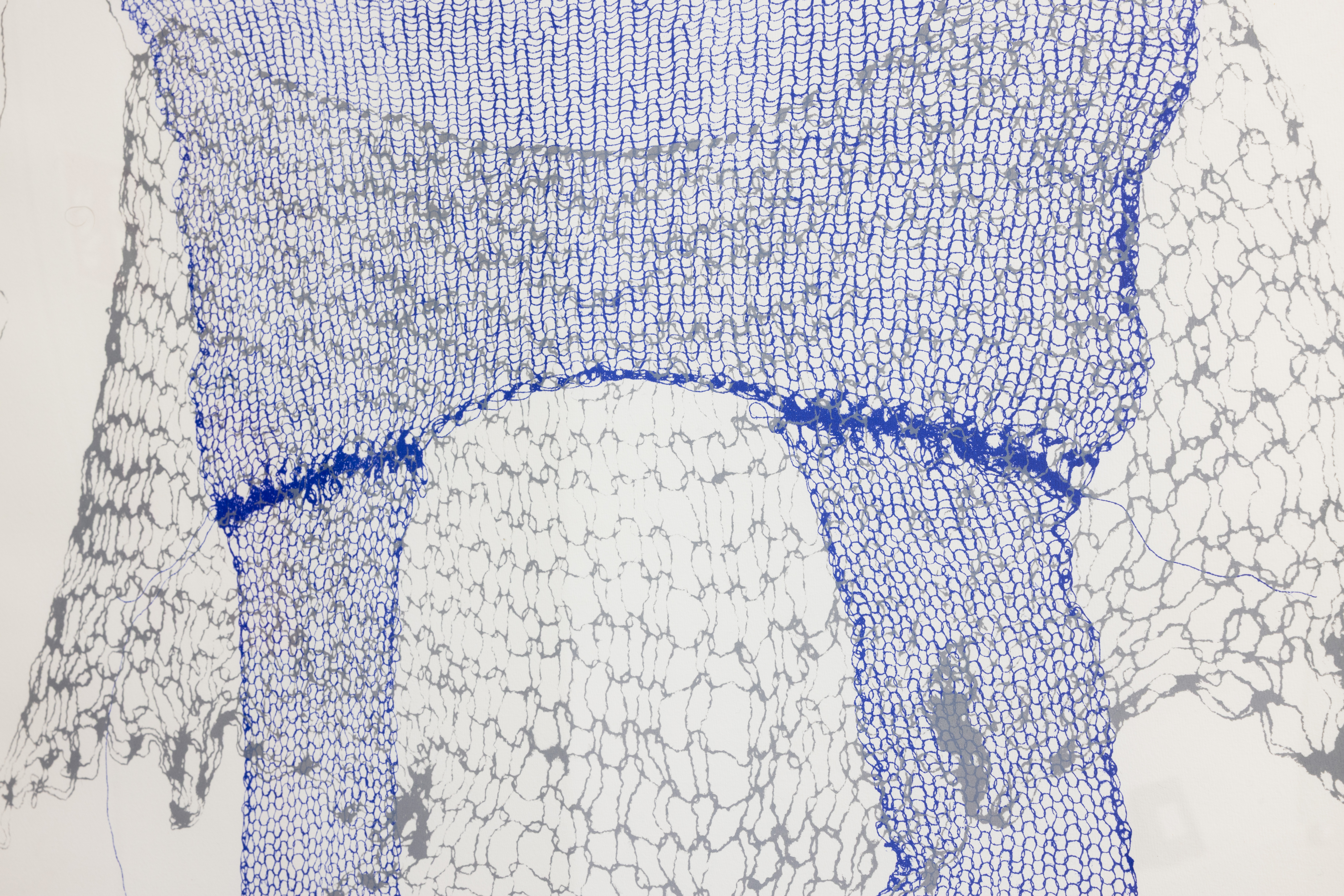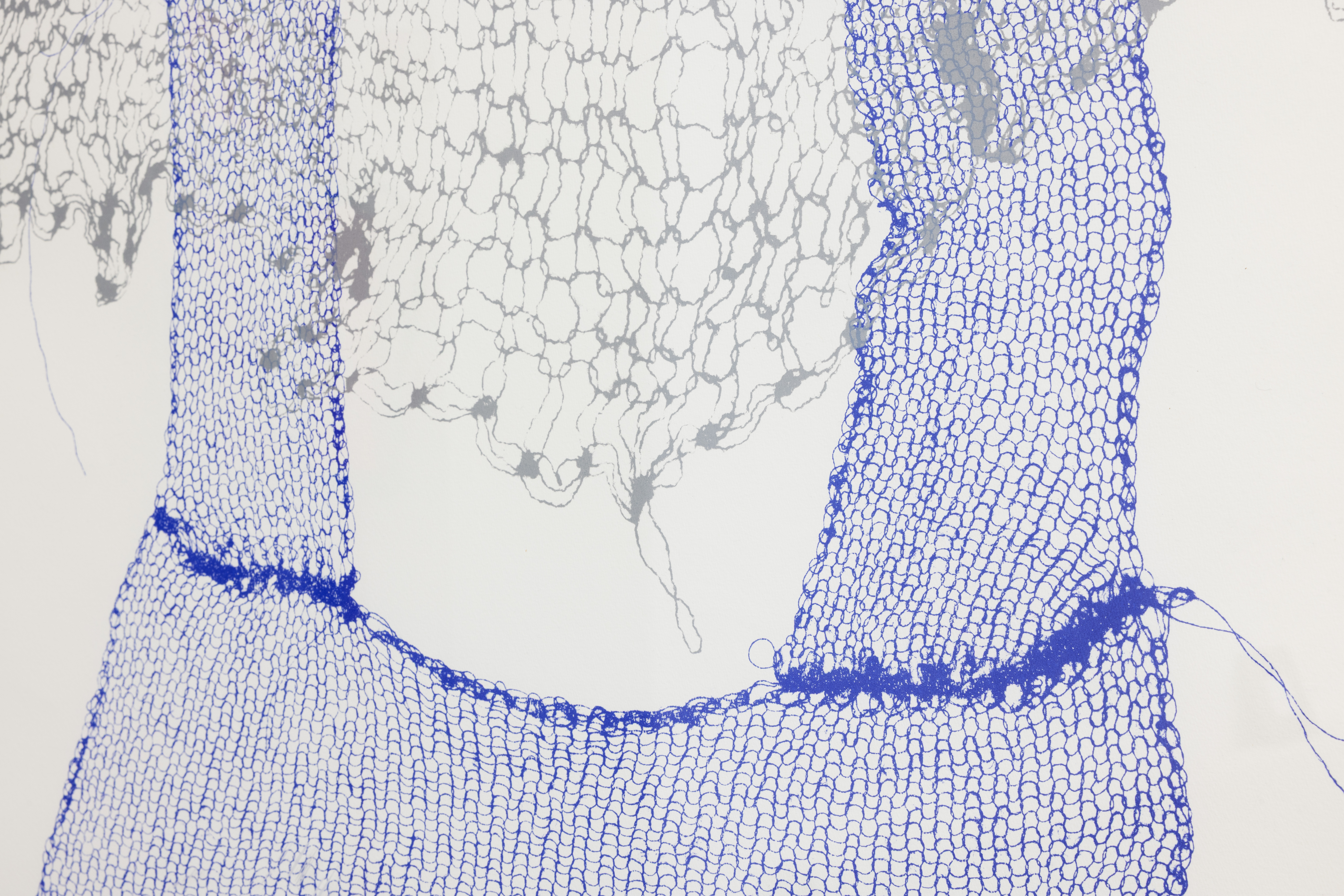 The knitted panel is then placed between a sheet of glass and the silkscreen plate for exposure in UV light. The photosensitive layer painted on the silkscreen allows the lights to precisely picture every detail from the knitted garment, transferring the original shape and haptics of the fabric into a two-dimensional image. The process of exact image transfer from an object into an image not only creates a portrait of the muted panel, which is considered by the artist a graphic score for the sound piece, but also it is an experimentation to transform something ephemeral and fragile into something more robust and rather eternal. The artist has always worked with yarn as a sculptural material, and despite its beautiful and complex visual impression, the material is very fragile and might collect clusters of dust and deteriorate over time. In order to preserve the beautiful characteristics of the material and at the same time combat the fragility of it, the artist came up with silk screen as a technique to make some yarn evolve into a durable material. With the vibrant blue color printed on handmade paper, a feeling of delicacy and detail is immediately conveyed, similar to watching a piece of real knitted mohair garment.