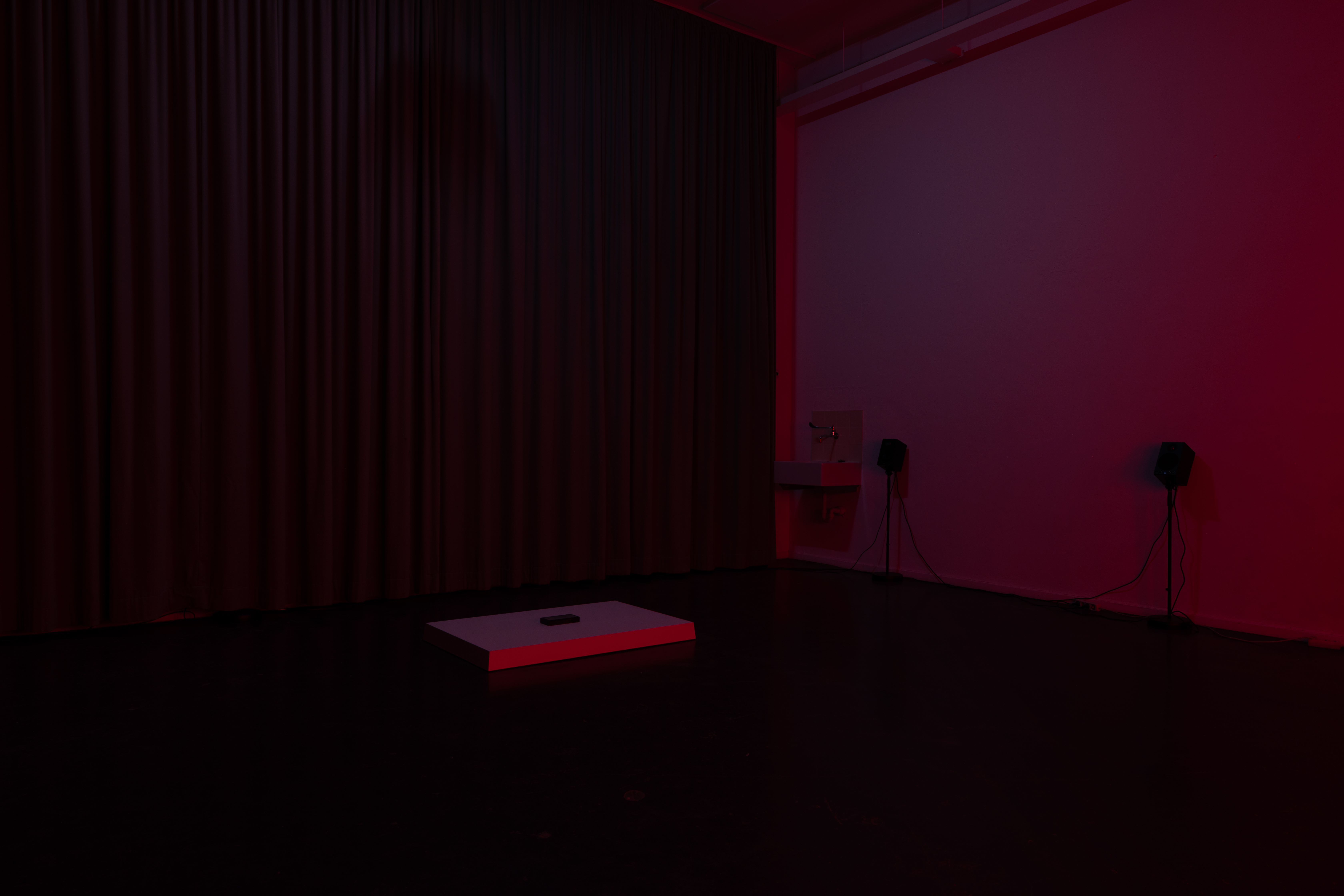 ‘The lights and the atmosphere are focusing and calming, but also challenging sensory perception. Do you remember how it felt listening to this voices, singings and chants? For me when you talked about it, I visualised something like a chorus, like chants or prayers in a way. The object referring much to smth. auratic producing a monumental gesture by a minimal one. Relating the object to your body, the materiality to our understanding of power and dissent. Sounds religious but I think it could be really strong to mimic smth in between anarchic, restoring collective power and freeing the inner voice, self etc..’(Arhun)