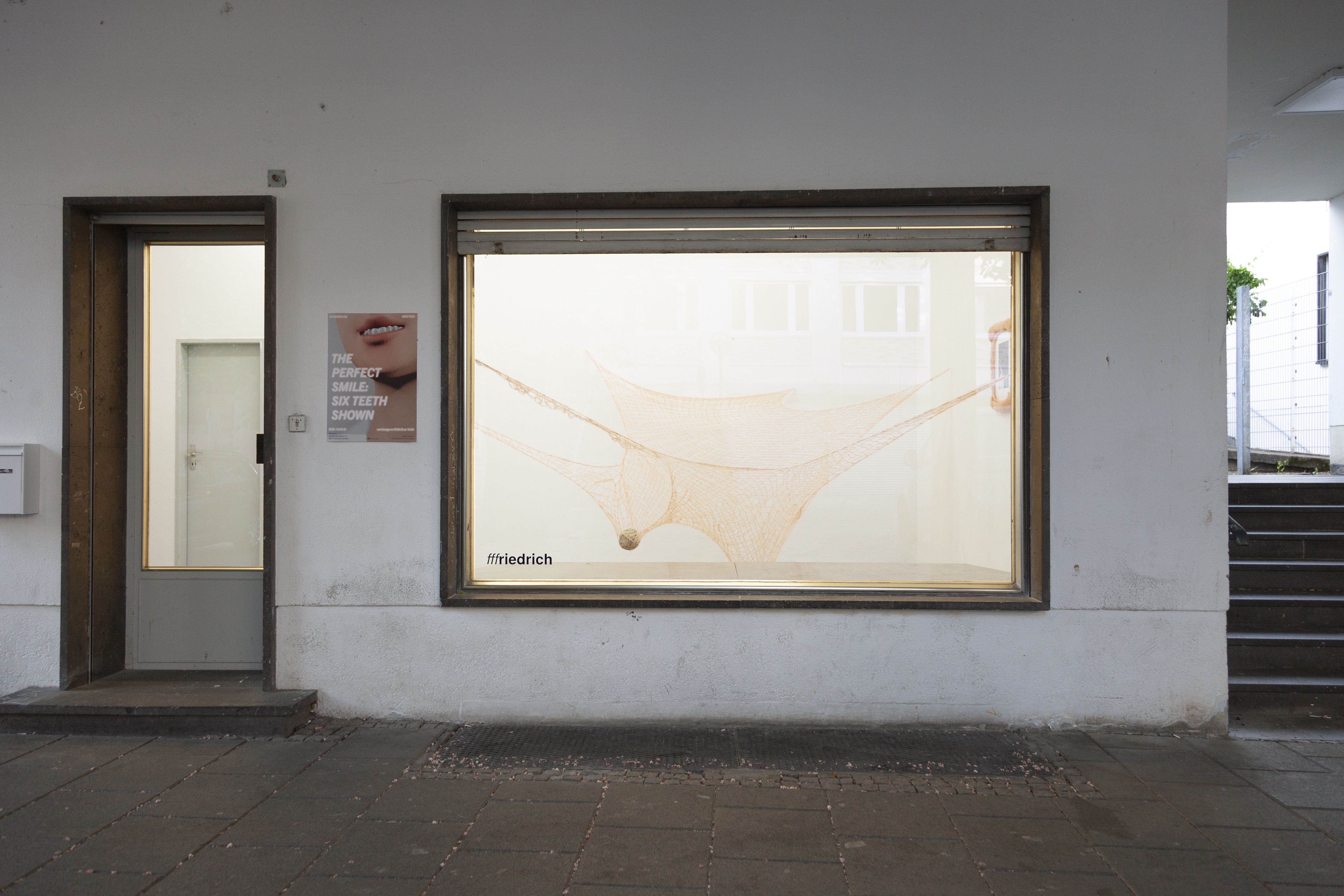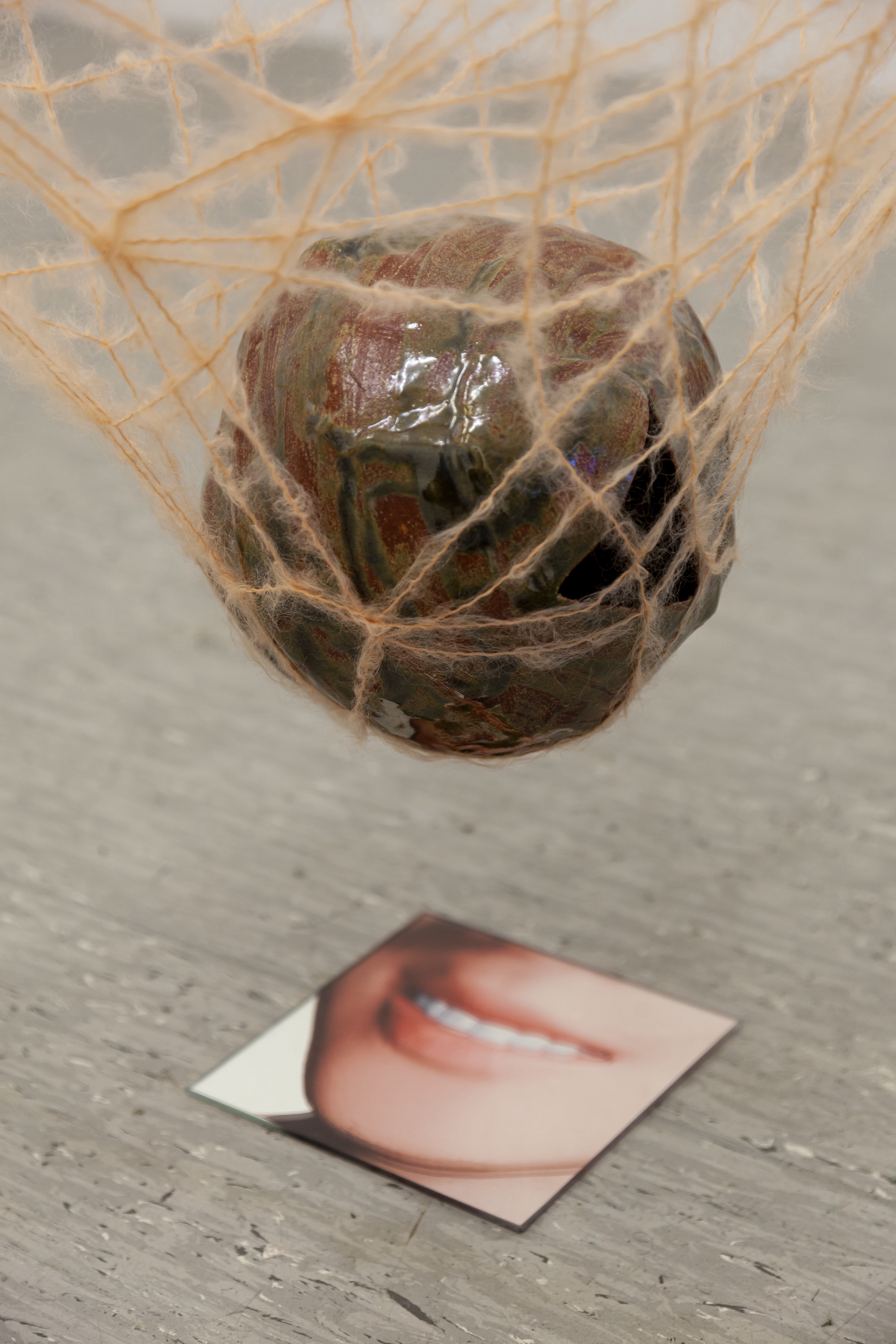 Nevertheless, each person experiences different limits for resilience, and emotions cannot be indefinitely put on hold. An exercise of patience is rendered in They Are Stretching Her As She Smiles, where a handcrafted biomorphic Mohair net sustains round ceramic elements menacing to take advantage of the interaction produced by gravity and the knitted fabric’s elasticity for falling over the fabricated grins. The tension between the self’s subjectivity and the expected homogeneous human behavior is also explored through the material contrast the installation evokes by overlaying handcraft and computer generated elements.
